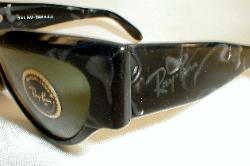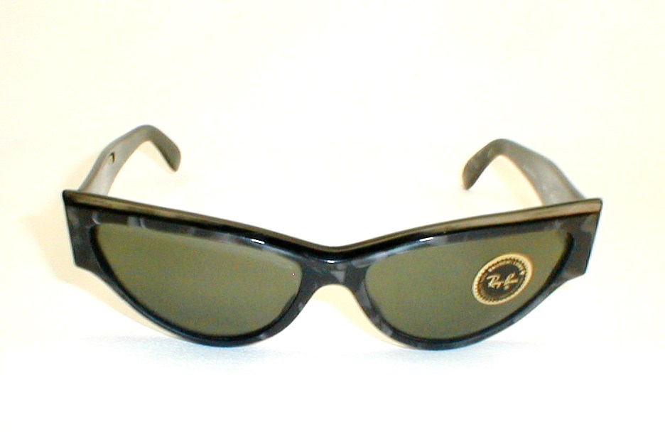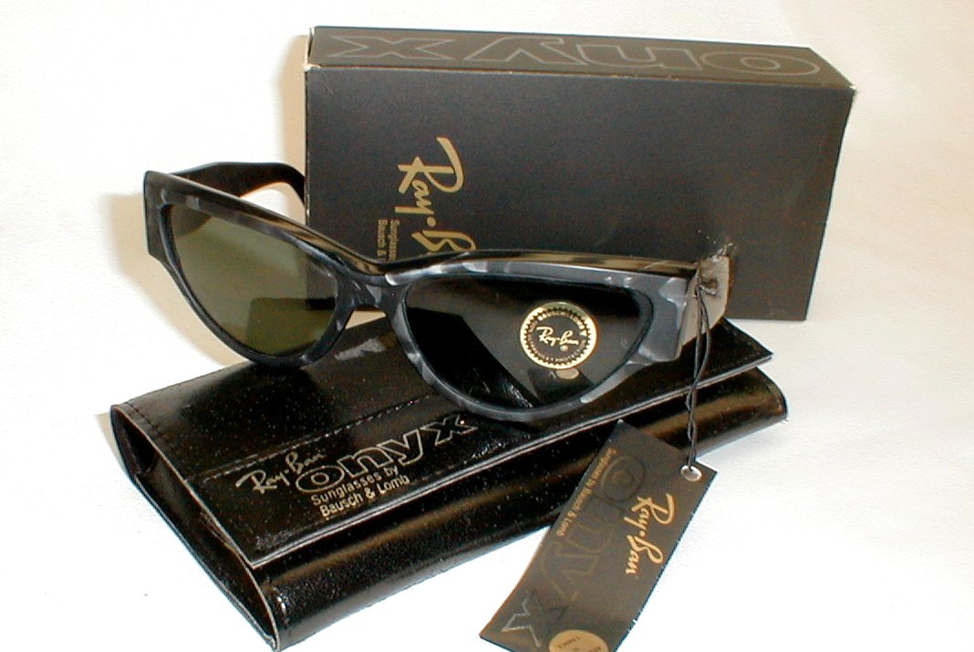 | Ray-Ban ONYX - Bausch & Lomb - WO 798 Condition: New, Old, Dealer Stock. Box & Papers "Ebony Strata" Frames with Green/Gray Bausch & Lomb Lenses. Ray-Ban logo on left temple. B&L etched into each lens. "B&L RAY-BAN USA... FRAME FRANCE ONYX WO 798". Measures: 5 7/8" across, 5 1/2" between the temples, 1 7/8" high, with 5 " wrap temples. $125.00 |