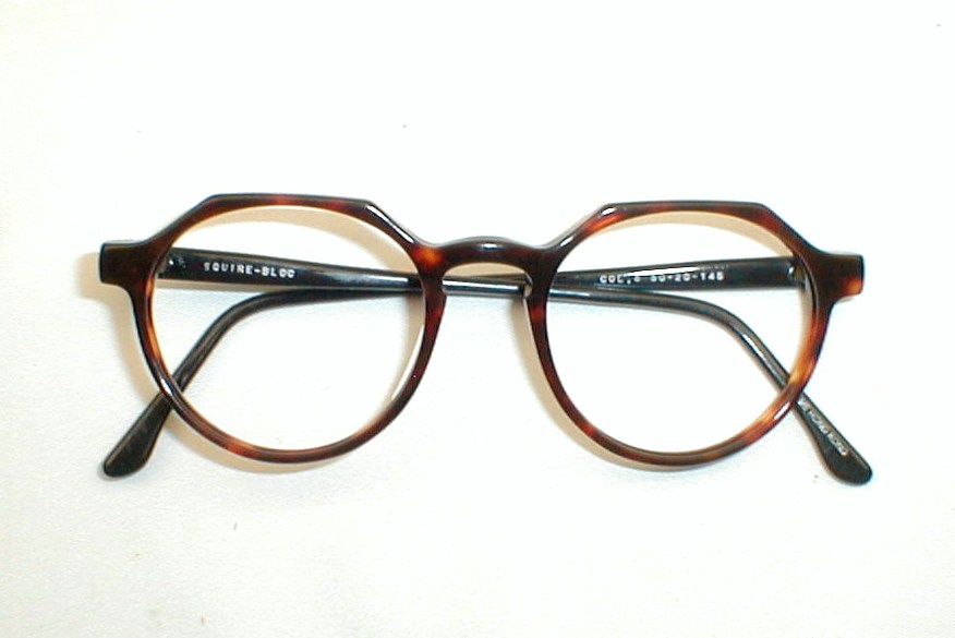 | Squire - Bloc Color: "13" Dark tortoise bridge with black temples Condition: Excellent! 80s Optometrist stock, Never Used. Measures: 5 1/8" across, 1 3/4" high (sz. 50-20) with 5 3/4" temples. Medium / Large $109.00 |