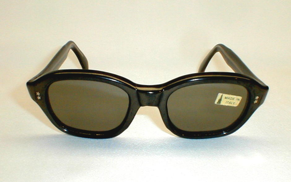 | 1960s Italian Sunglasses Thick Black Sunglasses with Big Hinges and Gray/Green Lenses. Made In Italy Condition: New, Old Dealer Stock, Excellent. Measures: 5 1/2" across, I 7/8" lens height - with 5 1/4" temples. $ 89.00 Questions? |