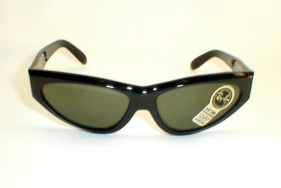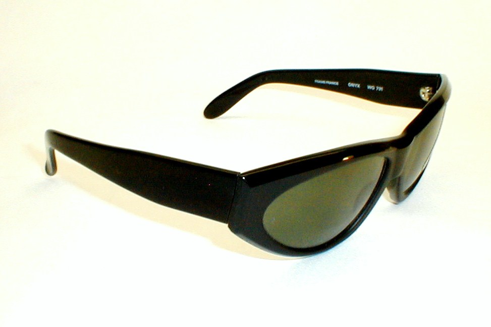 | Ray-Ban ONYX - Bausch & Lomb, WO-791 Condition: New, Old Dealer Stock - Case, Box, Papers Light-Weight Black Wrap Frames with Green/Gray Glass, Bausch & Lomb Lenses. Ray-Ban logo on left temple. B&L etched into each lens. "B&L RAY-BAN USA... FRAME FRANCE ONYX WO 971". Measures: 5 7/8" across, 5 3/4" between the temples, 1 3/4" high, with 5 1/2" head-hugger temples. $125.00 |