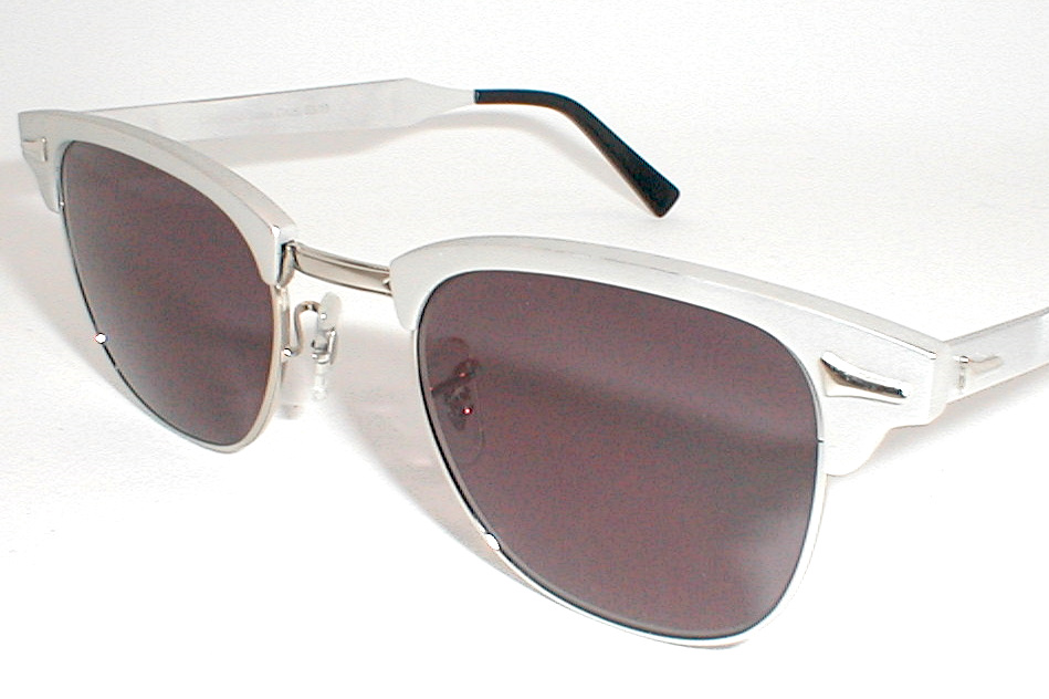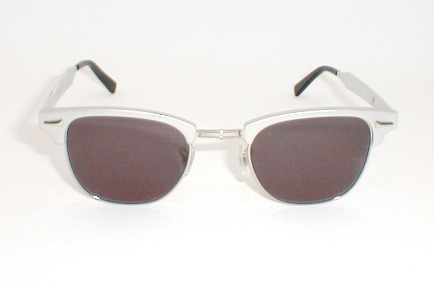Santa Cruz, Courtland Optical. Combonation 'Club-Man' Frame Polished, matte finished, aluminum. 'G-Man' brow-line style with silver stainless chassis. Awesome Chrome accents at the corners & thick 5 barrel riveted hinges. The Lenses are Medium Gray Measures: 5 5/8" across, 5 1/2" (139mm) between the hinges. 1 3/4" high (sz. 50-22) with 5 3/4" temples. (Medium/Large) $169.00 |