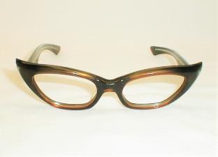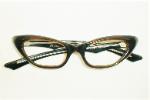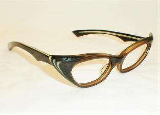 | Adelicia, AParis, 1960s - Frame France Color: Coffee-Amber with pearl layers over crystal and dark mocha brown. Measures: 5 5/8" across, point-to-point. 4 7/8" between the hinges (120mm), 1 3/8" high with 5 1/4" temples (size 46-20). Medium/Small $119.00 |