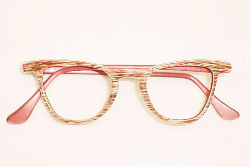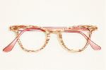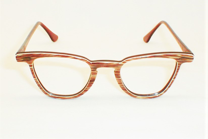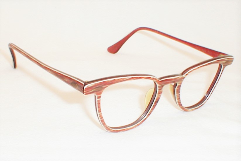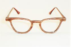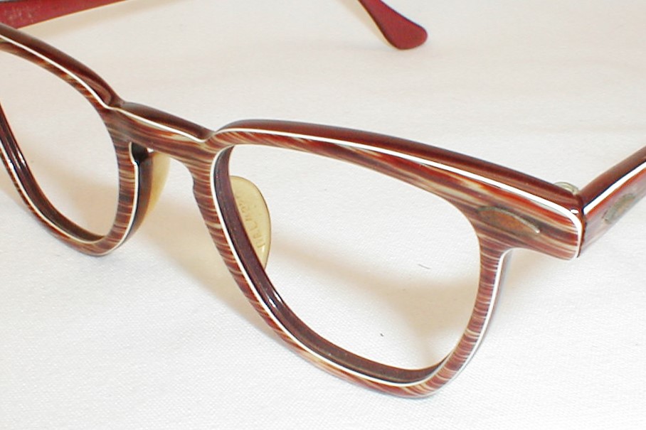 | Bal-Lite, Bausch & Lomb USA, 1950s. New/Old Optician Stock - Never Used - Mint. Color: Chestnut with white inlay. 3 SIZES: Measures: 4 3/4" across, 4 3/8" between the hinges (101mm), 1 1/2" high (sz. 42-20) with 5 1/2" temples. X-SMALL Measures: 4 7/8" across, 4 1/2" between the hinges (104mm), 1 1/2" high (sz. 44-20) with 5 1/2" temples. SMALL Measures: 5" across, 4 5/8" between the hinges (107mm), 1 5/8" high (sz. 46-18) with 5 3/4" temples. SMALL $118.00 |