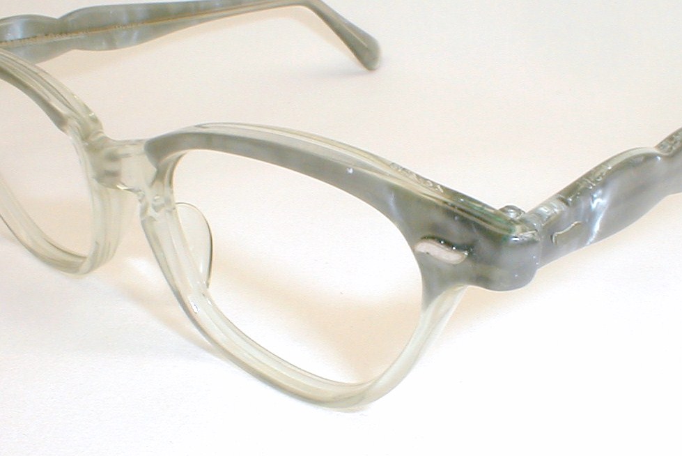 | Coquette. Titmus Optical USA, 50s Gray marbled inlay over crystal. Measures: 5 1/4" across, 5" between the hinges (128mm), 1 1/2" high with 5 1/2" temples (size 46-20). Medium Unused vintage optometrist stock. $119.00 |