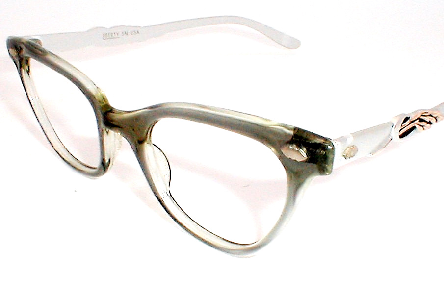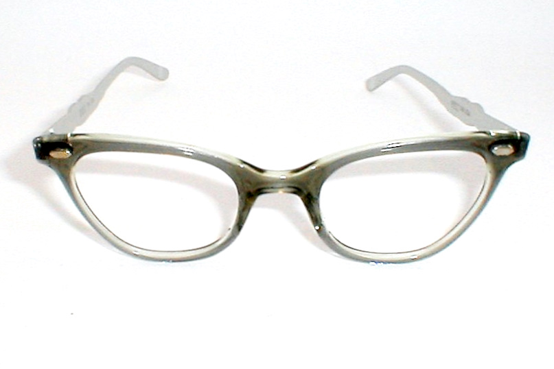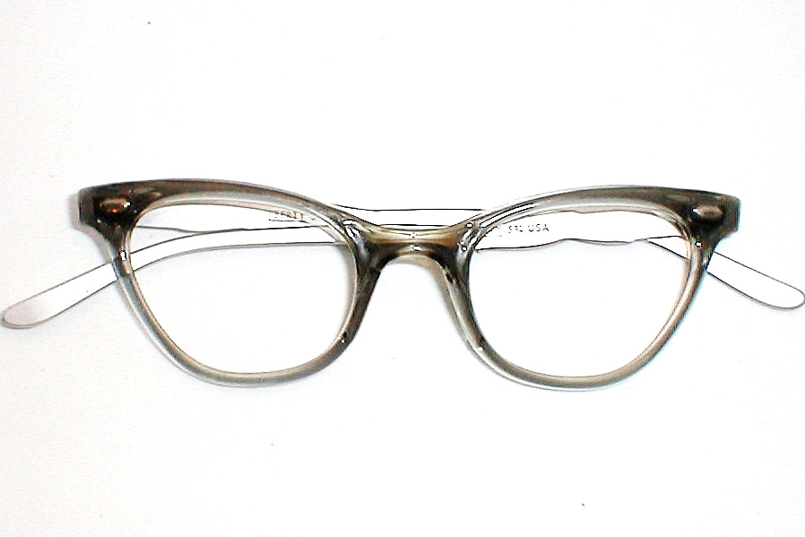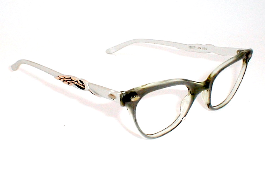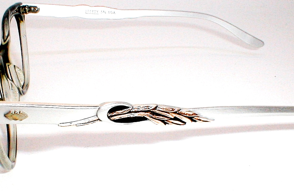 | St. James.. Liberty Optical, USA. 1960s Color: Blue/Gray smoke bridge with matte aluminum temples, glossy rose-gold accents. Size 46-24 - Measures: 5 1/4" across, 5" between the hinges (127mm). 1 5/8" high with 5 3/4" temples. MEDIUM Unused optometrist stock, Flawless $116.00 |