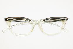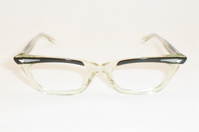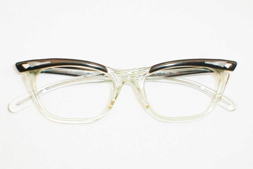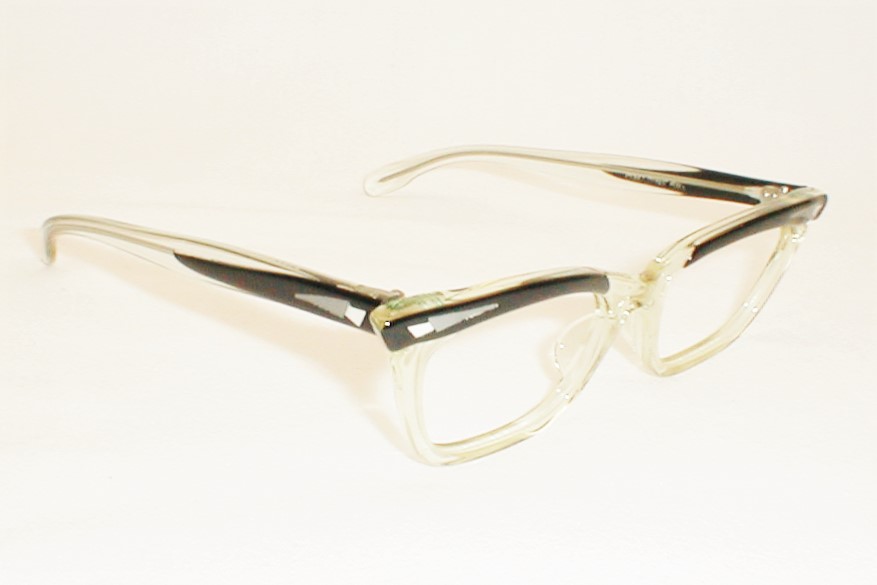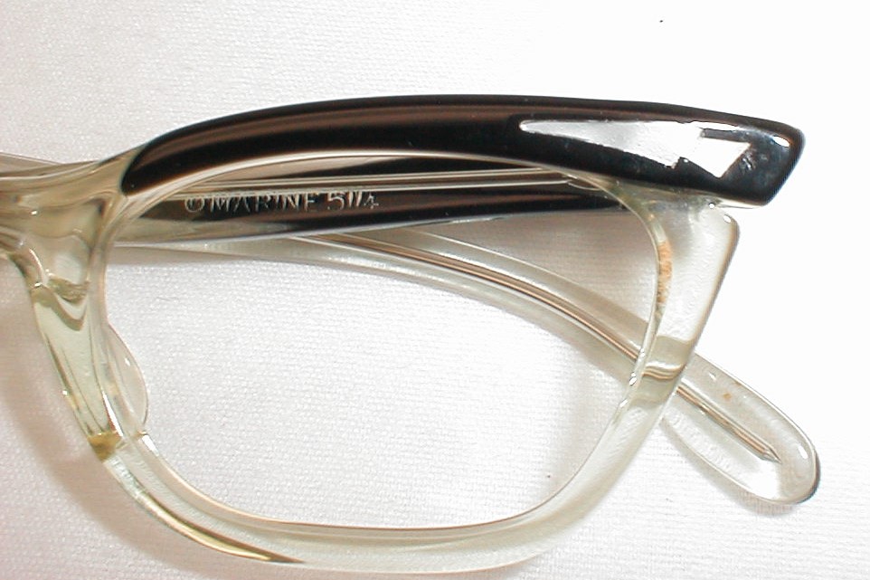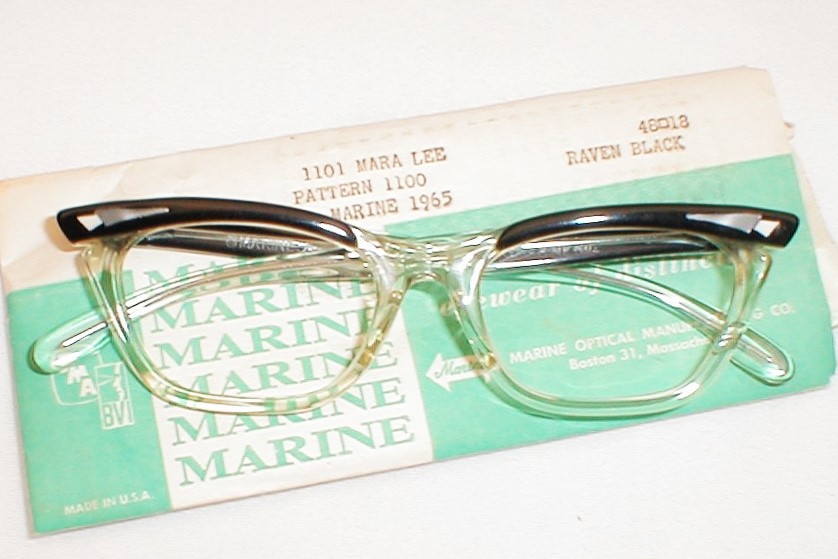 | Marine Optical USA, 1950s-60s Color: Raven Black over crystal. Excellent - New/Old Optician Old Stock, Mint 3 Sizes: REALLY SMALL: Measures 4 7/8" across (point-to-point), 4 3/8" between the hinges (114mm). 1 3/8" high with 5 1/2" temples (size 44-18). SMALL: Measures 5 1/8" across (point-to-point), 4 5/8" between the hinges (117mm). 1 3/8" high with 5 1/2" temples (size 46-18). MEDIUM: Measures 5 1/4" across (point-to-point), 4 7/8" between the hinges (124mm). 1 3/8" high with 5 1/2" temples (size 48-20) $99.00 |