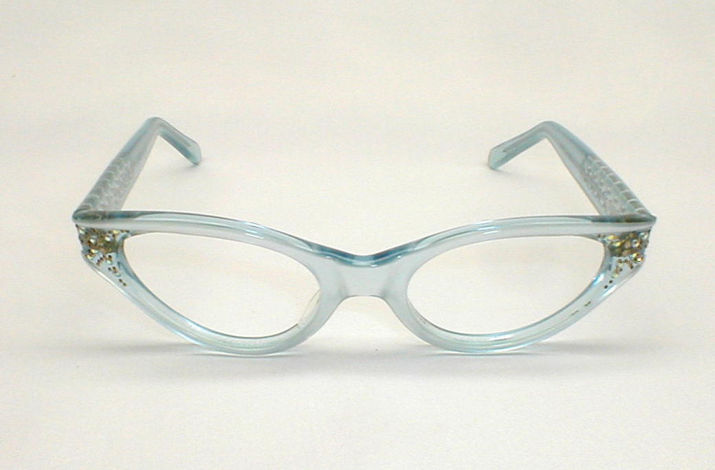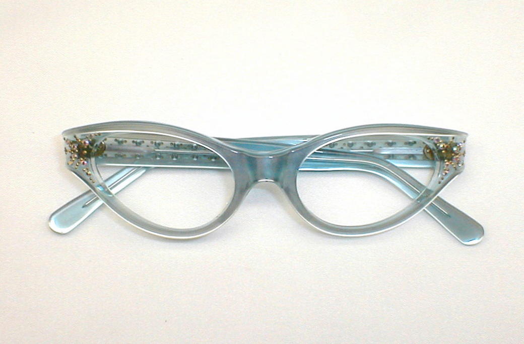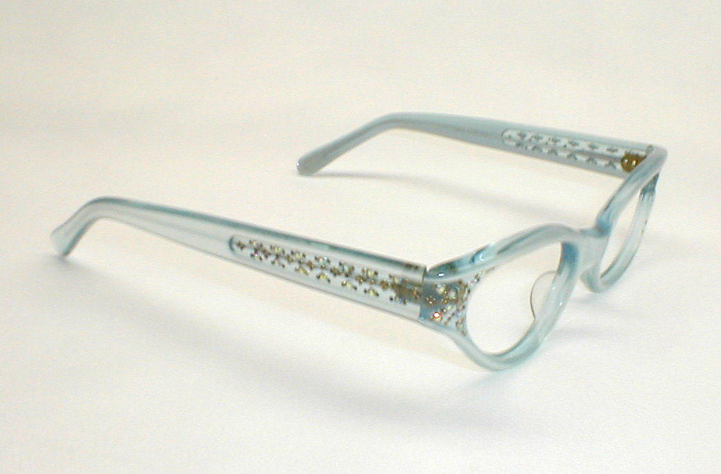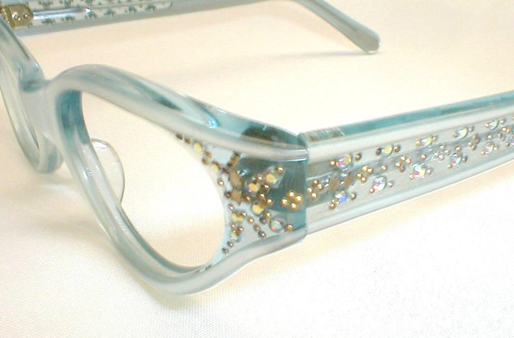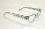 | Blue Betty. Stenzel, Frame France Color: Blue and Blue Pearl with Rhinestones. Measures: 5 1/8" across, 4 3/4" between the hinges, 1 3/8" high, with 5 1/4" temples (size 46-20)... Medium. Please measure at home for a good fit - click here for size questions. New, old optometrist stock - Excellent $136.00 |