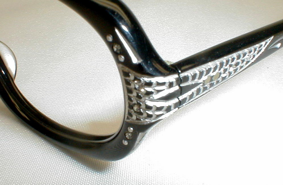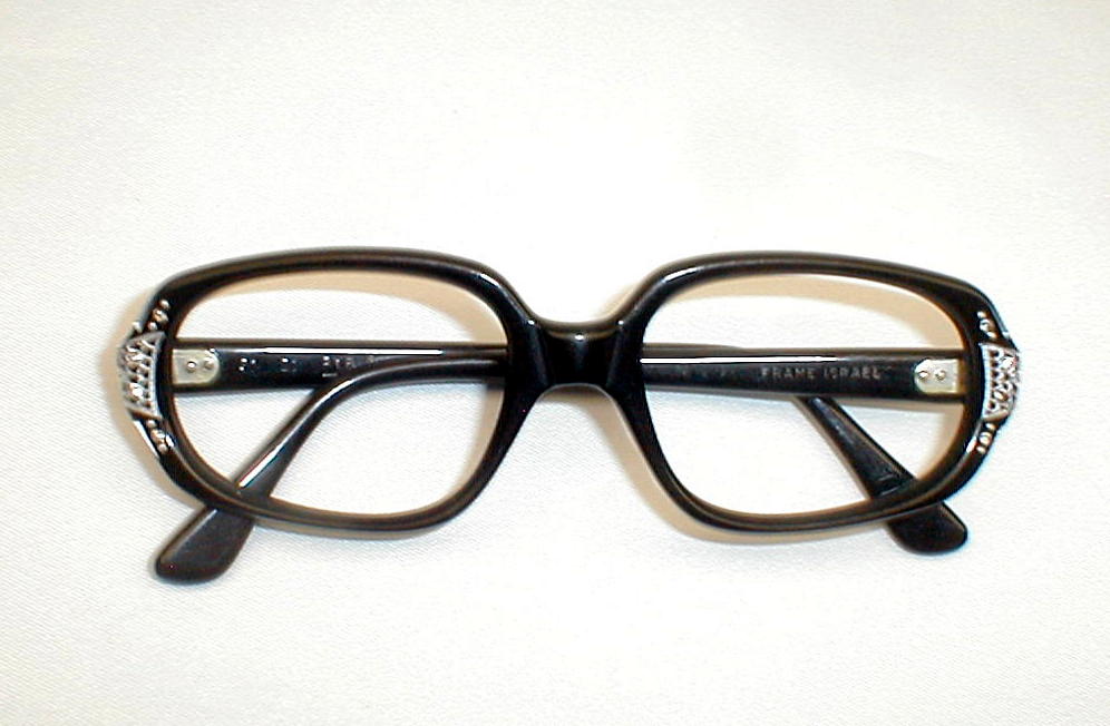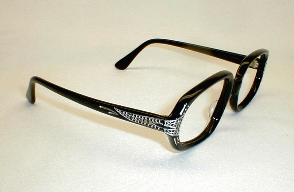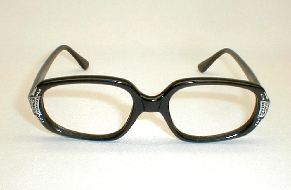| Alexis - Frame Israel Color: Black with Silver accents and Rhinestones. Measures: 5 1/8" across, 5" between the temples, 1 5/8" high (sz. 50-20) with 5 1/2" temples. Medium / Large Please measure at home for a good fit - click here for size questions. Unused optometrists stock... Mint. $116.00 |