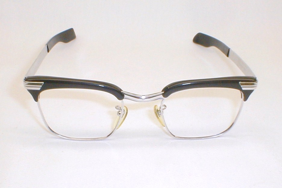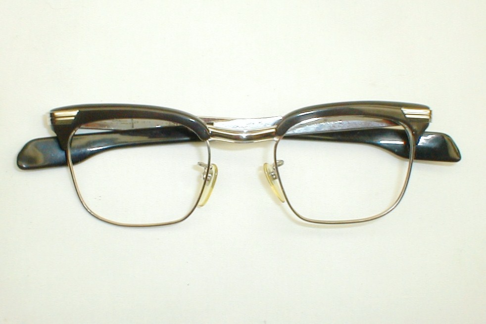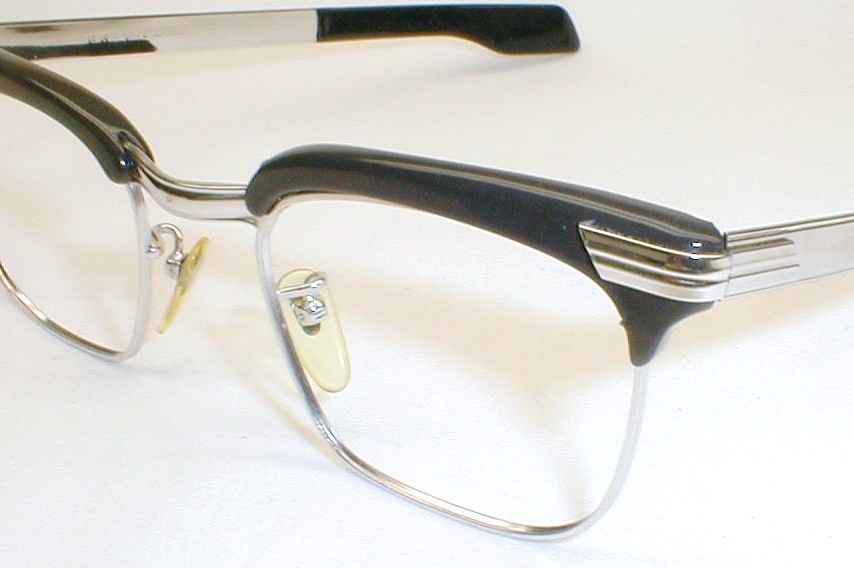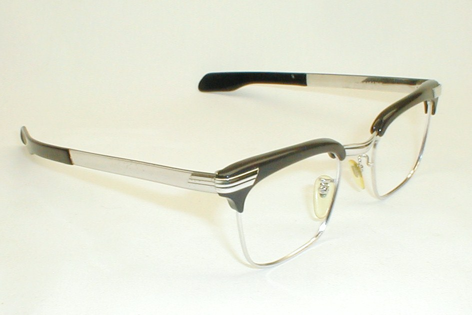 | Frame Made In Austria 50s-60s Color: Black brows with 12K White-Gold Filled Chassis and Temples and Art Deco Accents. Large: Measures: 5 1/4" across (133mm) between the hinges, 1 5/8" high with 5 3/4" temples (size 48-24). $168.00 |