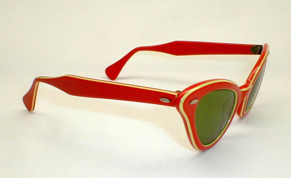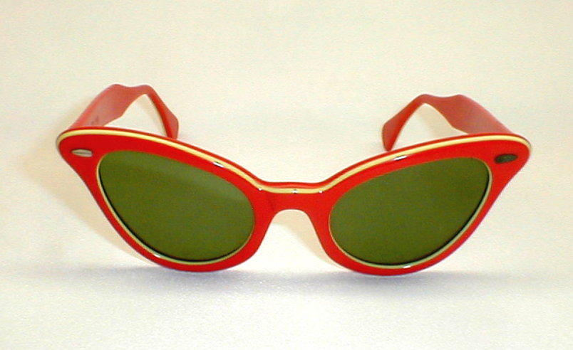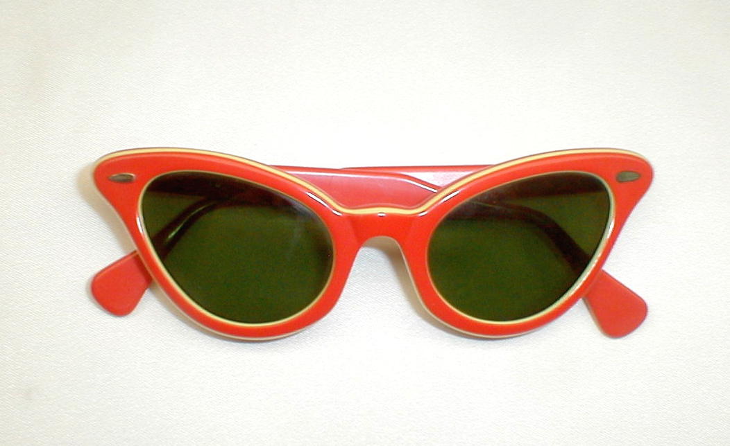 | Vintage 80s Cat Sunglasses. (TS 723) Color: Thick, high quality Italian Zyloware, layered in orange and yellow. Green glass lenses. Thick and Well Made. Measures: 5 1/4" across, 4 3/4" between the temples. 1 5/8" high (sz. 46-20) with 5 1/4" temples. New Old Stock .. Never Worn .. Flawless $69.00 |