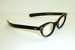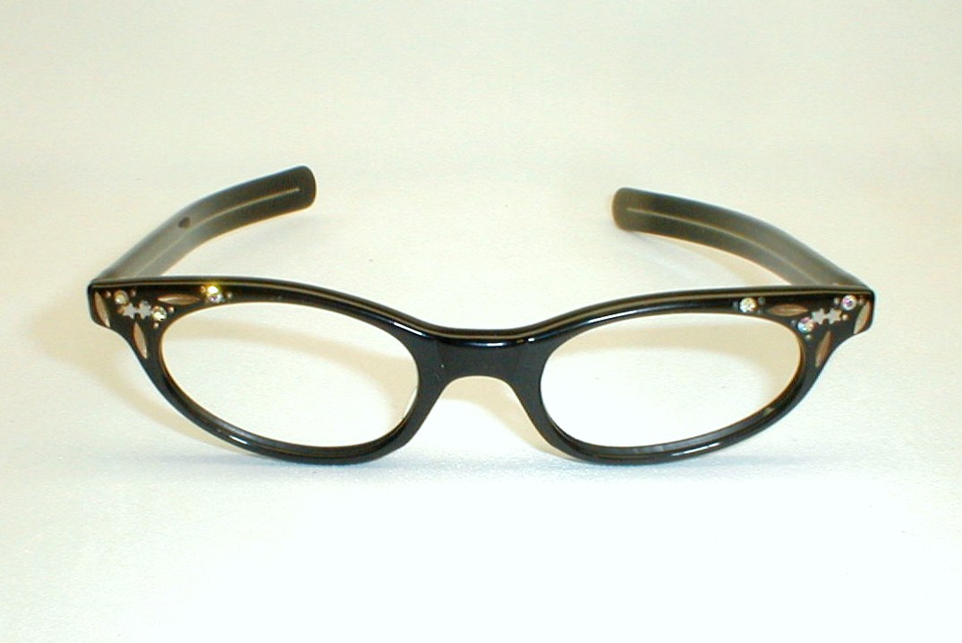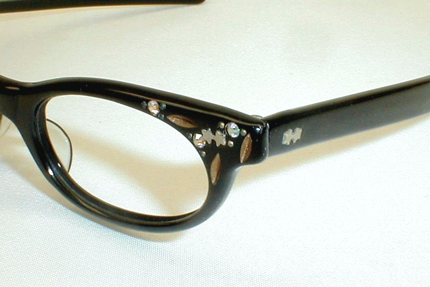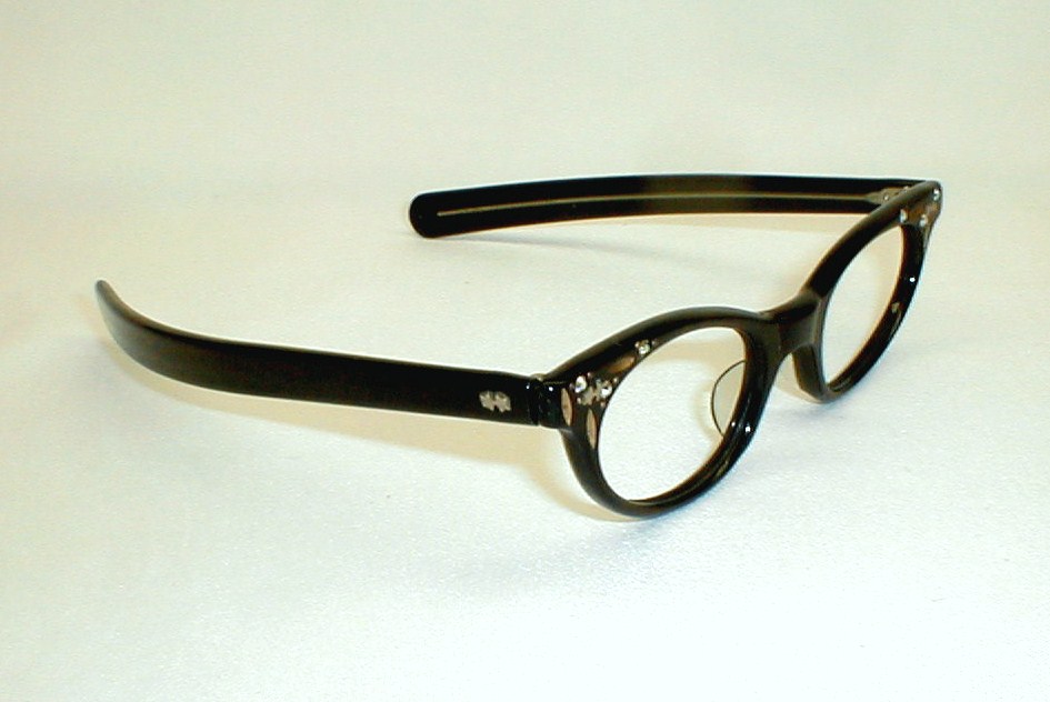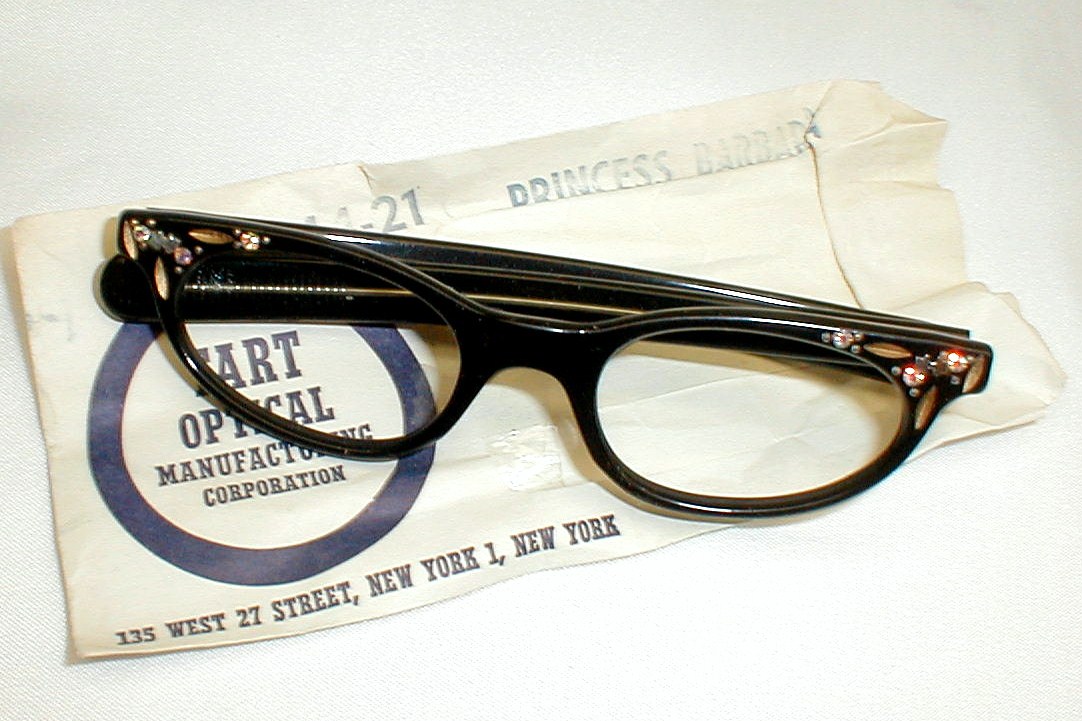 | Tart Optical, Princess Barbara Color: Black with accents and Rhinestones Measures: 5 " across, 1 1/4" high, (size 46-21) with 5" temples. New, old optometrist stock - Flawless $135.00 |